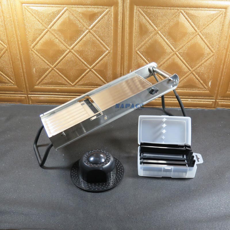 Điểm nổi bật nhất của model EAST 195110 chính là việc đi kèm 5 lưỡi dao khác nhau: thái lát mỏng, thái sợi nhỏ, sợi lớn, cắt lát sóng, và dao lưỡi tròn. Các đầu bếp có thể tùy chọn lưỡi dao phù hợp theo từng loại nguyên liệu, tạo hình món ăn đa dạng và đẹp mắt.