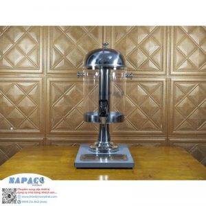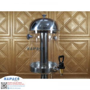 Thân bình trong suốt giúp dễ dàng quan sát màu sắc nước uống, nắp đậy inox bóng sáng nổi bật trên quầy phục vụ. Chân đế chắc chắn, có khay chứa nước rỉ tiện lợi giữ vệ sinh khu vực phục vụ.