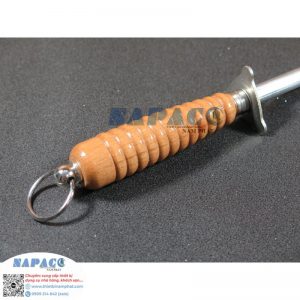 Cán gỗ được chế tác tỉ mỉ với các đường vân nổi nhẹ, giúp chống trơn trượt, tăng độ bám ngay cả khi tay ướt. Khoen inox ở cuối cán giúp dễ dàng treo móc, giữ cho khu vực làm việc gọn gàng, sạch sẽ.