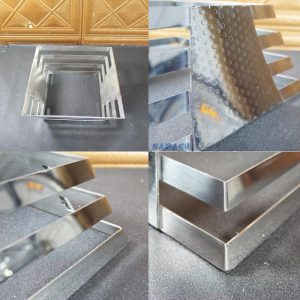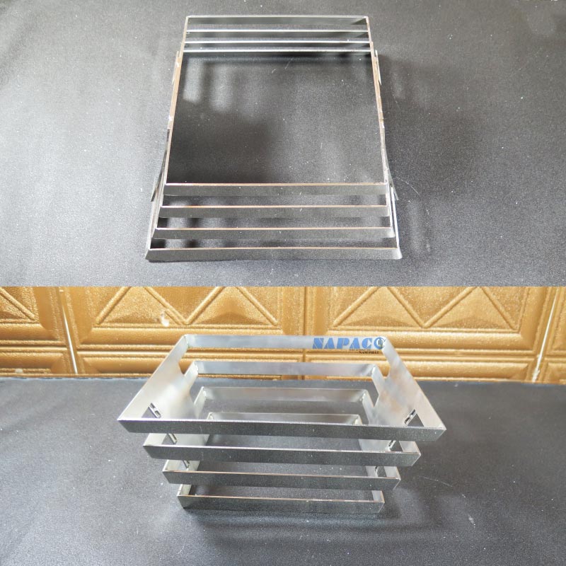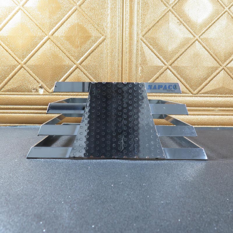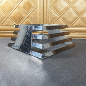 Thiết kế 4 tầng (bậc thang) không đơn thuần là một khung đỡ, mà là một tác phẩm nghệ thuật hình khối. Các thanh nan inox được xếp song song một cách tỉ mỉ, tạo độ thông thoáng tuyệt đối. Điều này không chỉ giúp bàn tiệc trông hiện đại, thanh thoát hơn mà còn tạo hiệu ứng chiều sâu, khiến các khay thức ăn như được “tôn vinh” ở những độ cao khác nhau, kích thích thị giác và vị giác của thực khách ngay từ cái nhìn đầu tiên.