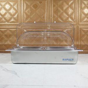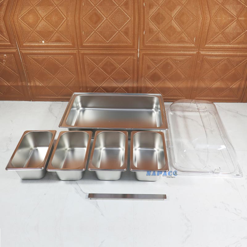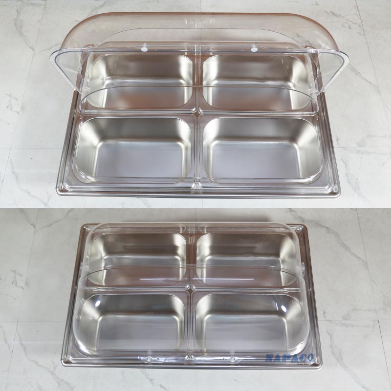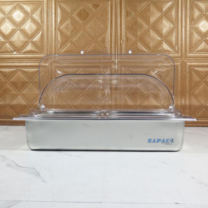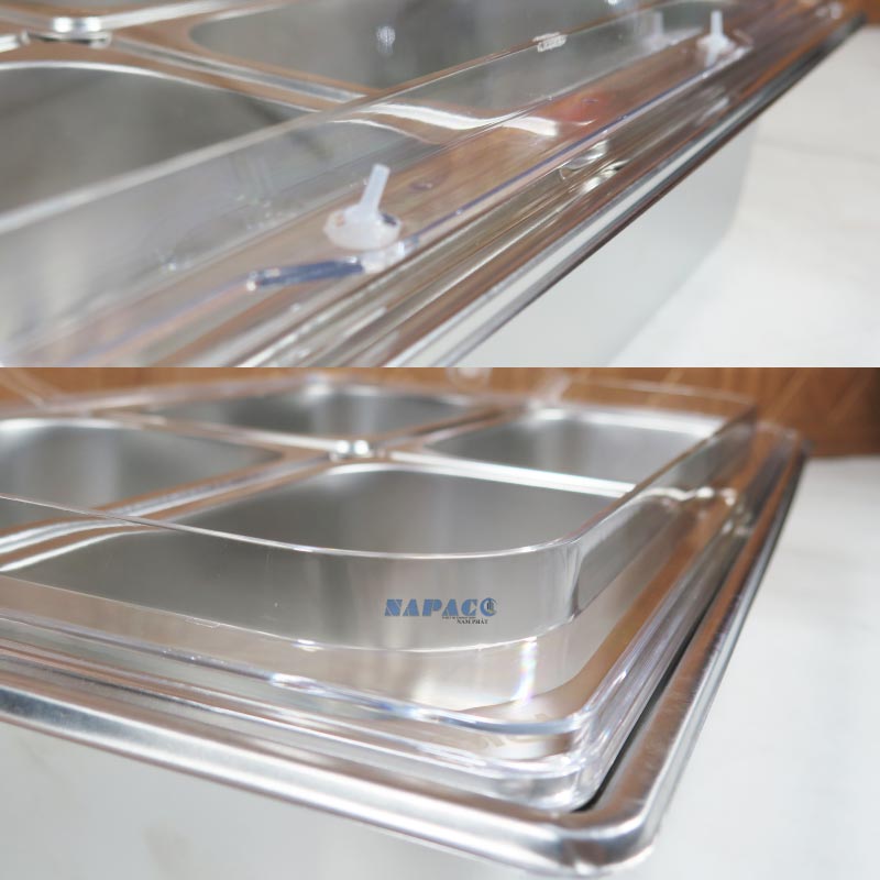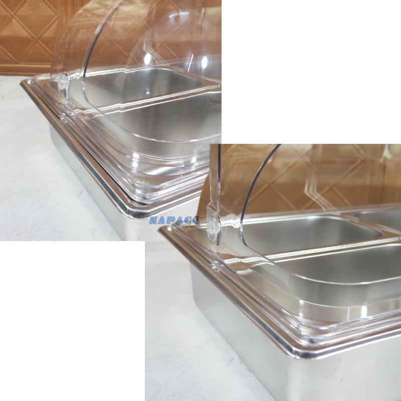 Nắp PC (polycarbonate) có độ trong suốt cao, giúp dễ nhìn thấy thực phẩm bên trong mà vẫn ngăn bụi, côn trùng và giữ thức ăn sạch sẽ. Nắp thiết kế mở lên nhẹ nhàng, tiện dụng cho cả nhân viên phục vụ lẫn khách tự lấy thức ăn.