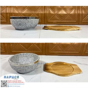 Mỗi thố đều đi kèm một đế gỗ chắc chắn, giúp bảo vệ bề mặt bàn khỏi nhiệt độ cao khi đặt thố nóng lên. Đế gỗ có thiết kế tự nhiên, hài hòa với thố đá, tạo nên sự kết hợp tinh tế.