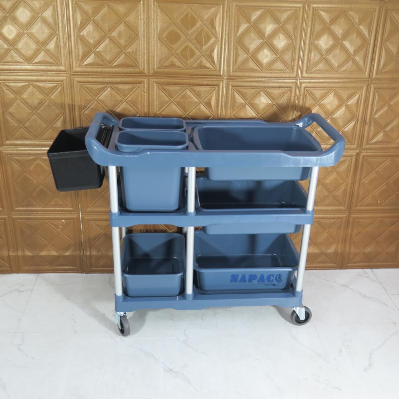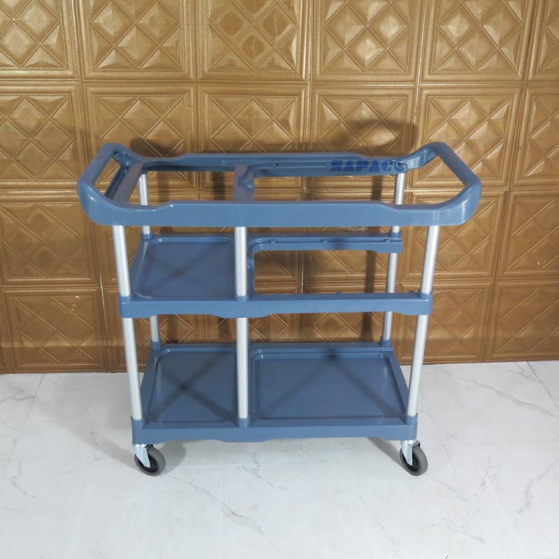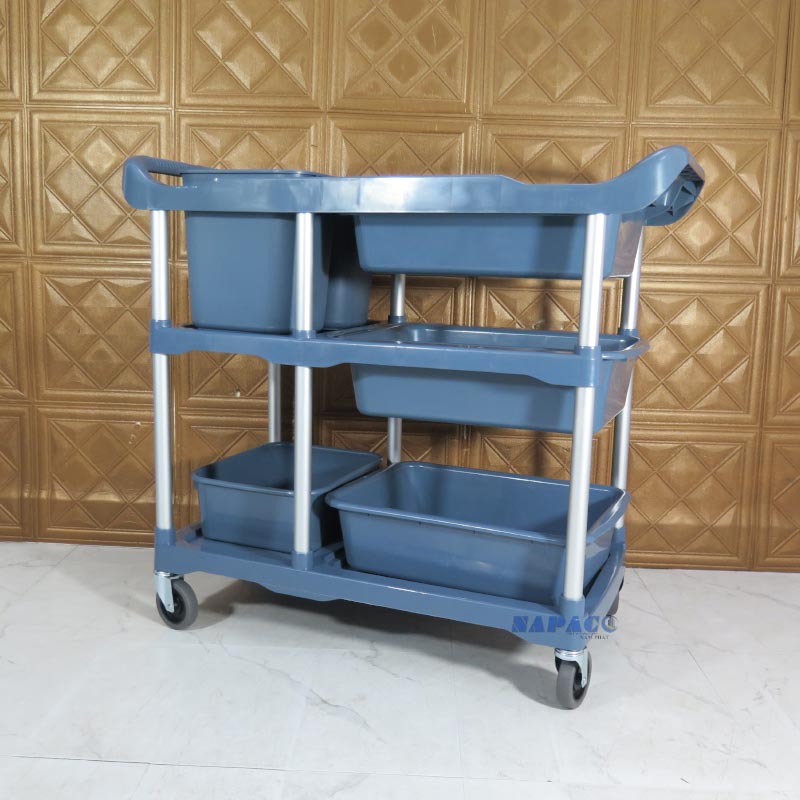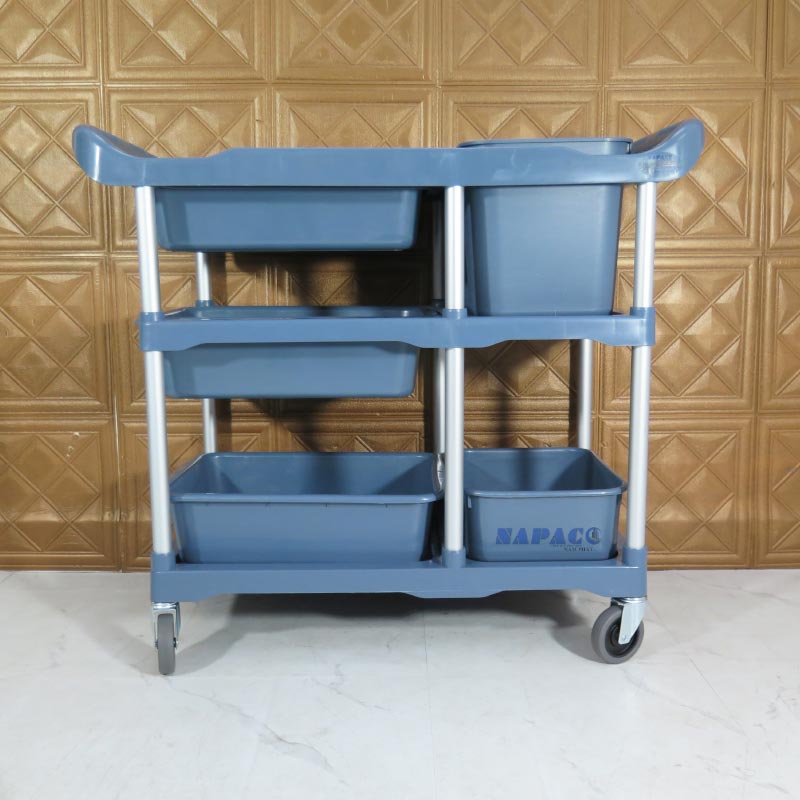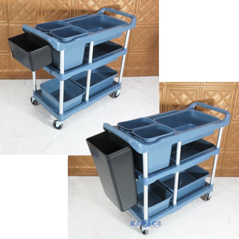 Dòng xe đẩy 3 tầng có khay nhựa này được thiết kế phân cấp khoa học. Với 3 tầng rộng rãi, bạn có thể phân loại bát đĩa, ly tách ngay trong quá trình thu gom. Điều này giúp giảm thiểu rủi ro đổ vỡ và tiết kiệm đáng kể thời gian cho bộ phận rửa bát khi tiếp nhận đồ bẩn.