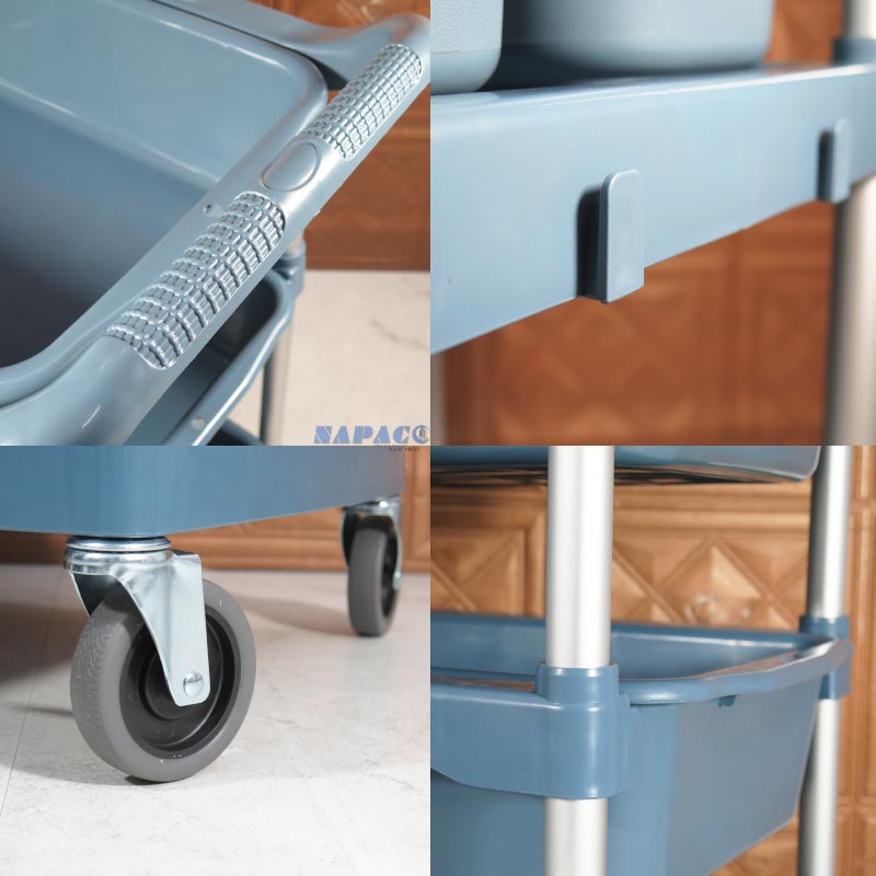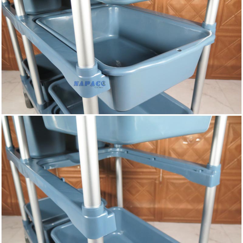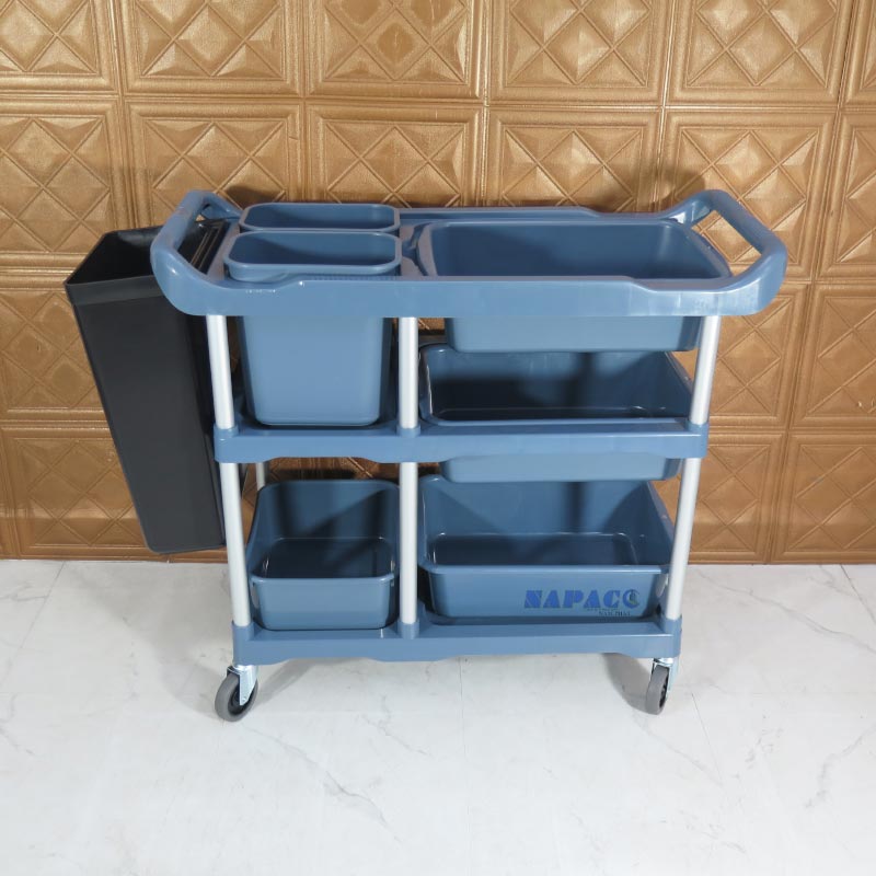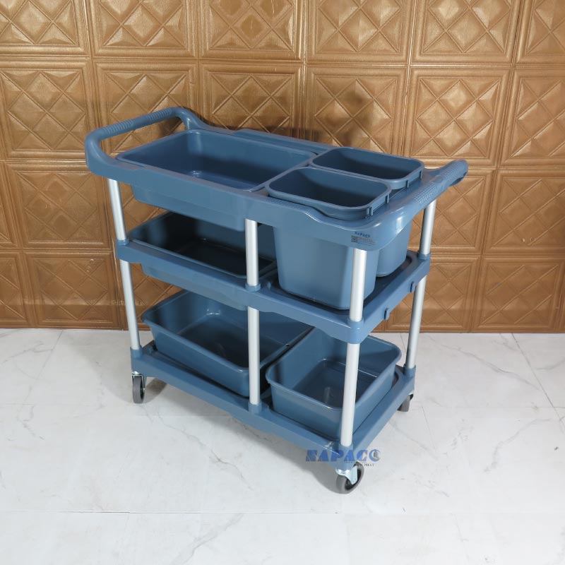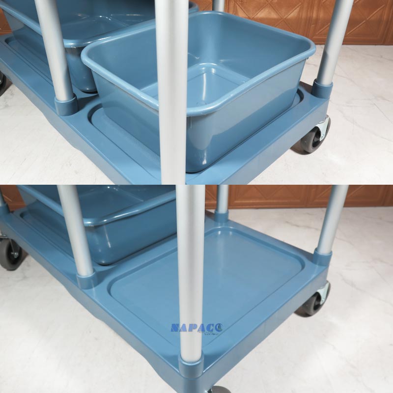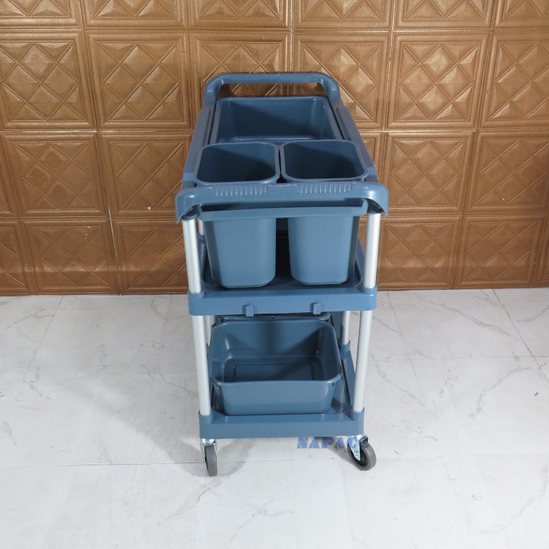 Dòng xe đẩy 3 tầng có khay nhựa này được thiết kế phân cấp khoa học. Với 3 tầng rộng rãi, bạn có thể phân loại bát đĩa, ly tách ngay trong quá trình thu gom. Điều này giúp giảm thiểu rủi ro đổ vỡ và tiết kiệm đáng kể thời gian cho bộ phận rửa bát khi tiếp nhận đồ bẩn.